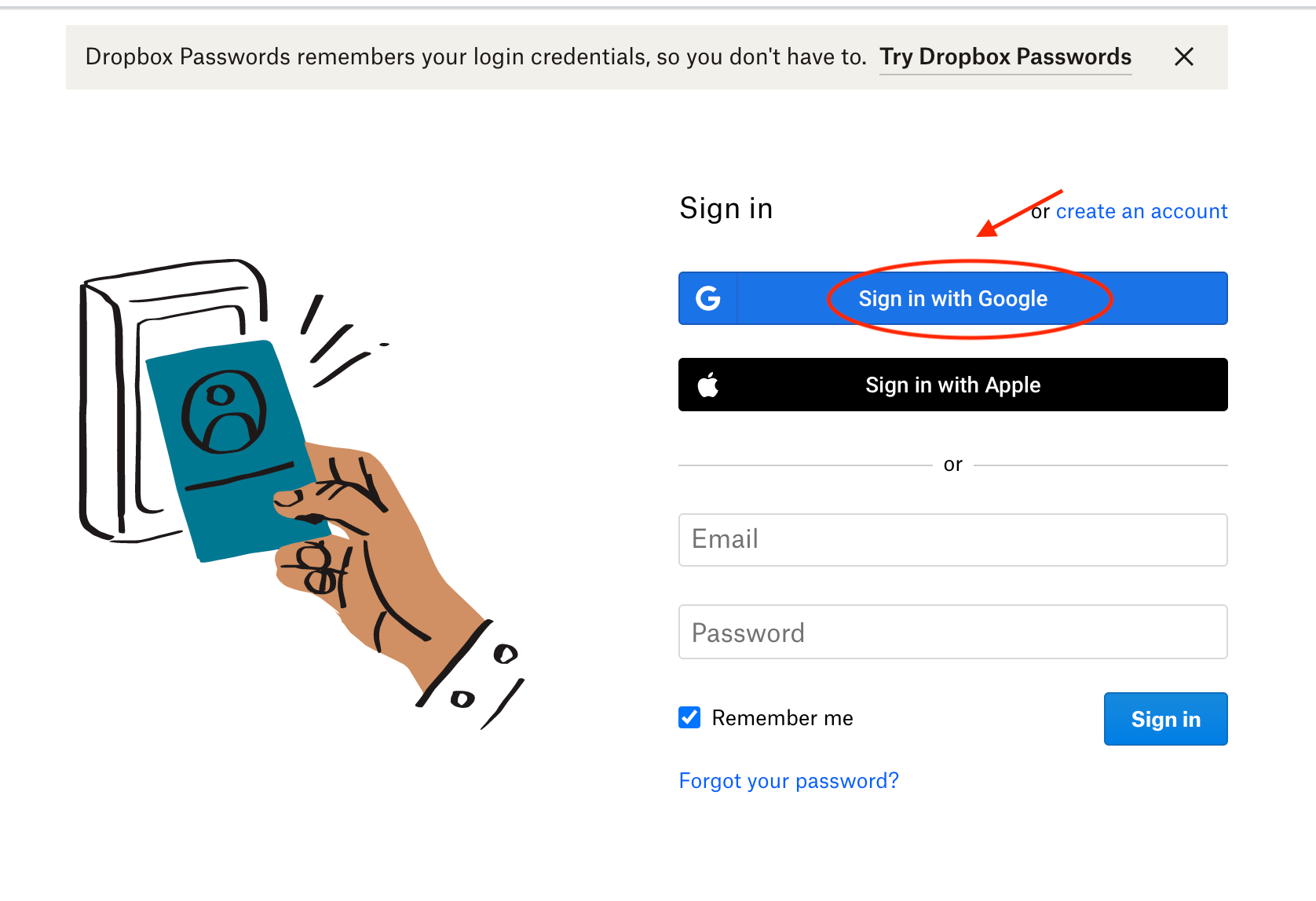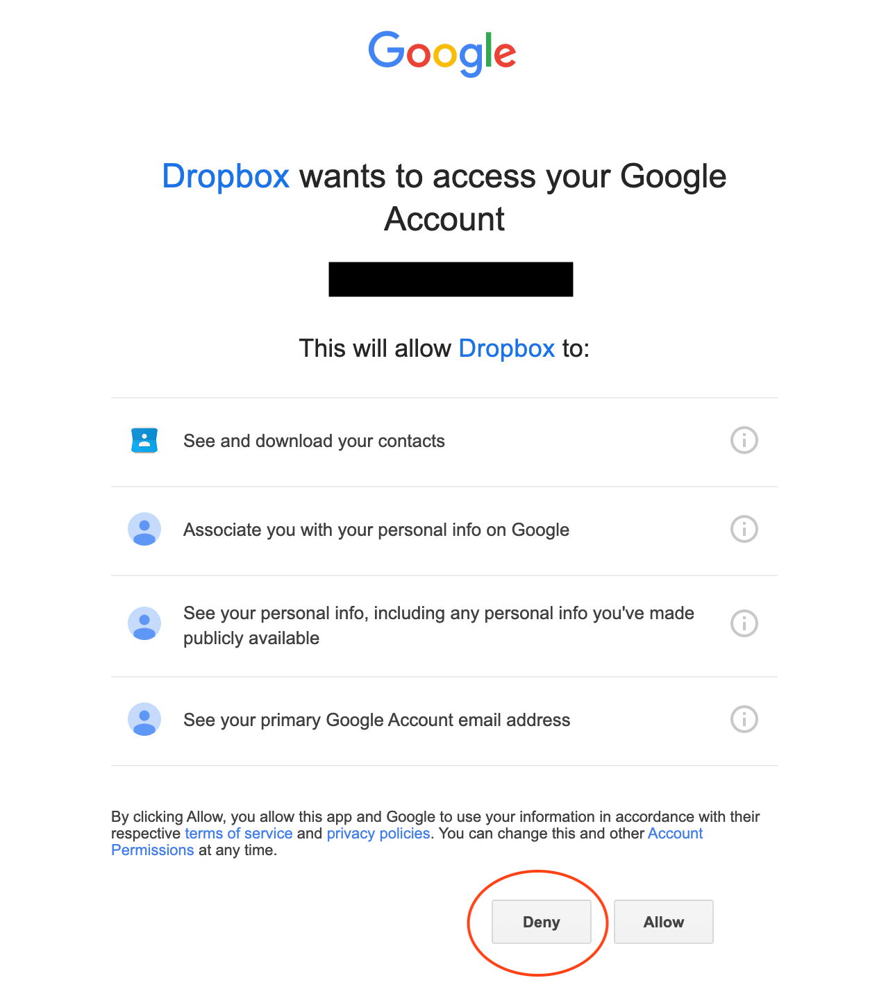 After you log in to Google, you may be redirected to a page asking you to grant Dropbox access to your google account. You can safely deny this: