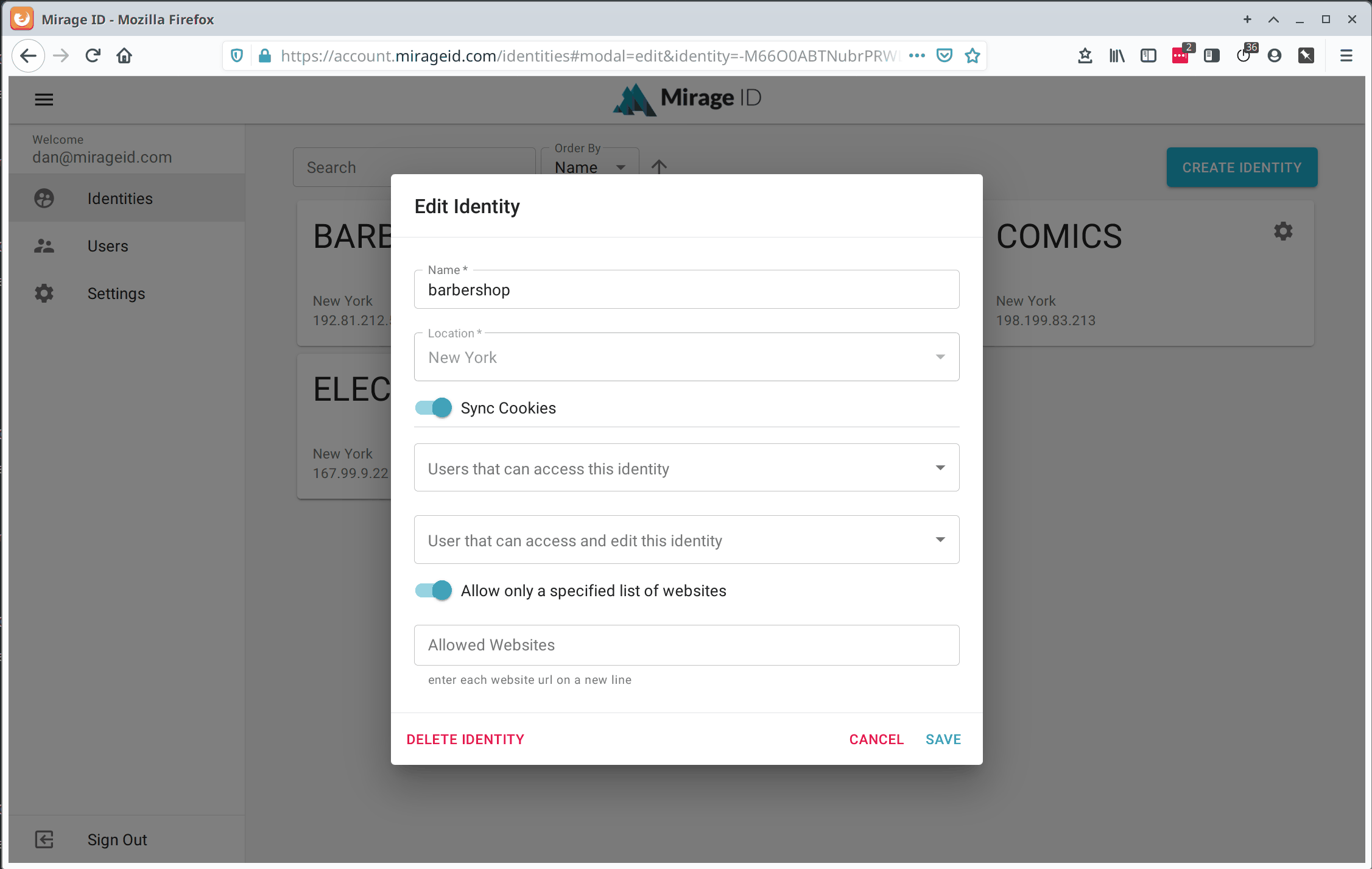 Then choose the Identity for which you want to add a Whitelist filter, and click the Gear Icon in the top corner. Enable the “Allow only a specified list of websites” slider, and click “Save”.