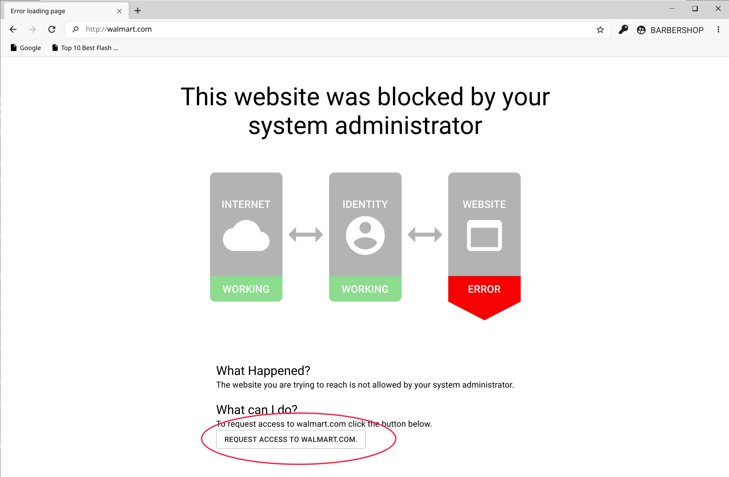 When one of your users attempts to access a website that is not on the Whitelist, they will see a page indicating that the site has been blocked. The user can request access directly from that page, and an administrative user on your account will receive an email with a link to add that site to the Whitelist for that Identity.